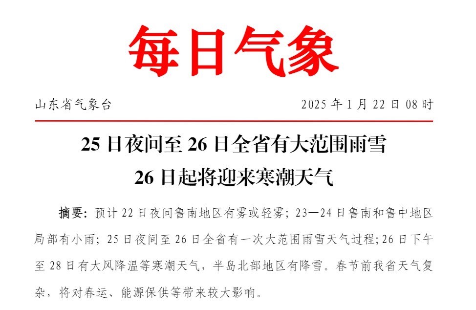 25—26日,全省天气阴,鲁西北、鲁中和半岛地区有小雨或雨夹雪转小到中雪局部大雪,其他地区有小雨或雨夹雪转小雪。北风,滨州、东营、潍坊、日照和半岛地区3~4级增强到5~6级阵风7~8级,其他地区3~4级增强到4~5级阵风6~7级。